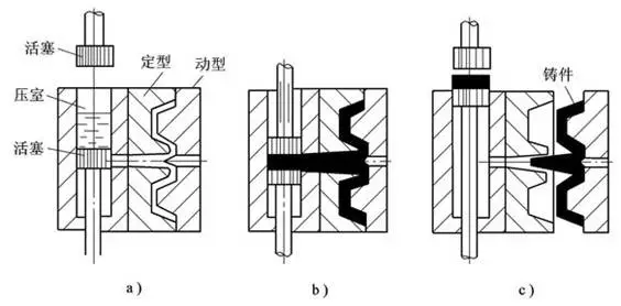 a)合型澆注        b) 壓射            c) 開型頂件
